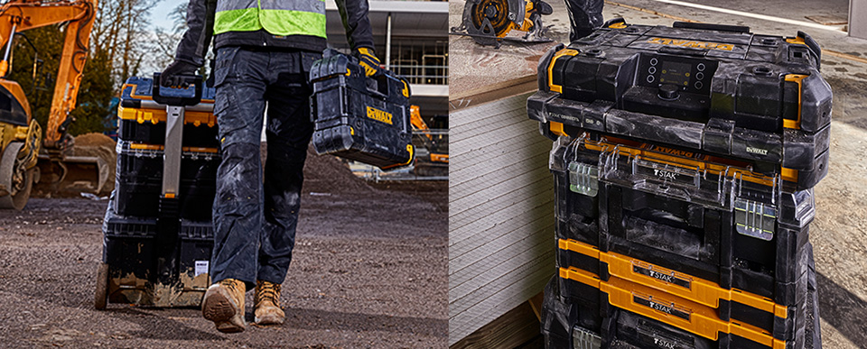 TSTAK järjestelmään yhdistettävä radio on XR-yhteensopiva ja toimii sekä 10,8V/18V ja XR FLEXVOLT 54V -akuilla ja verkkovirralla. Verkkovirtaan yhdistettynä laite lataa joko 10,8V/18V tai 54V akut.